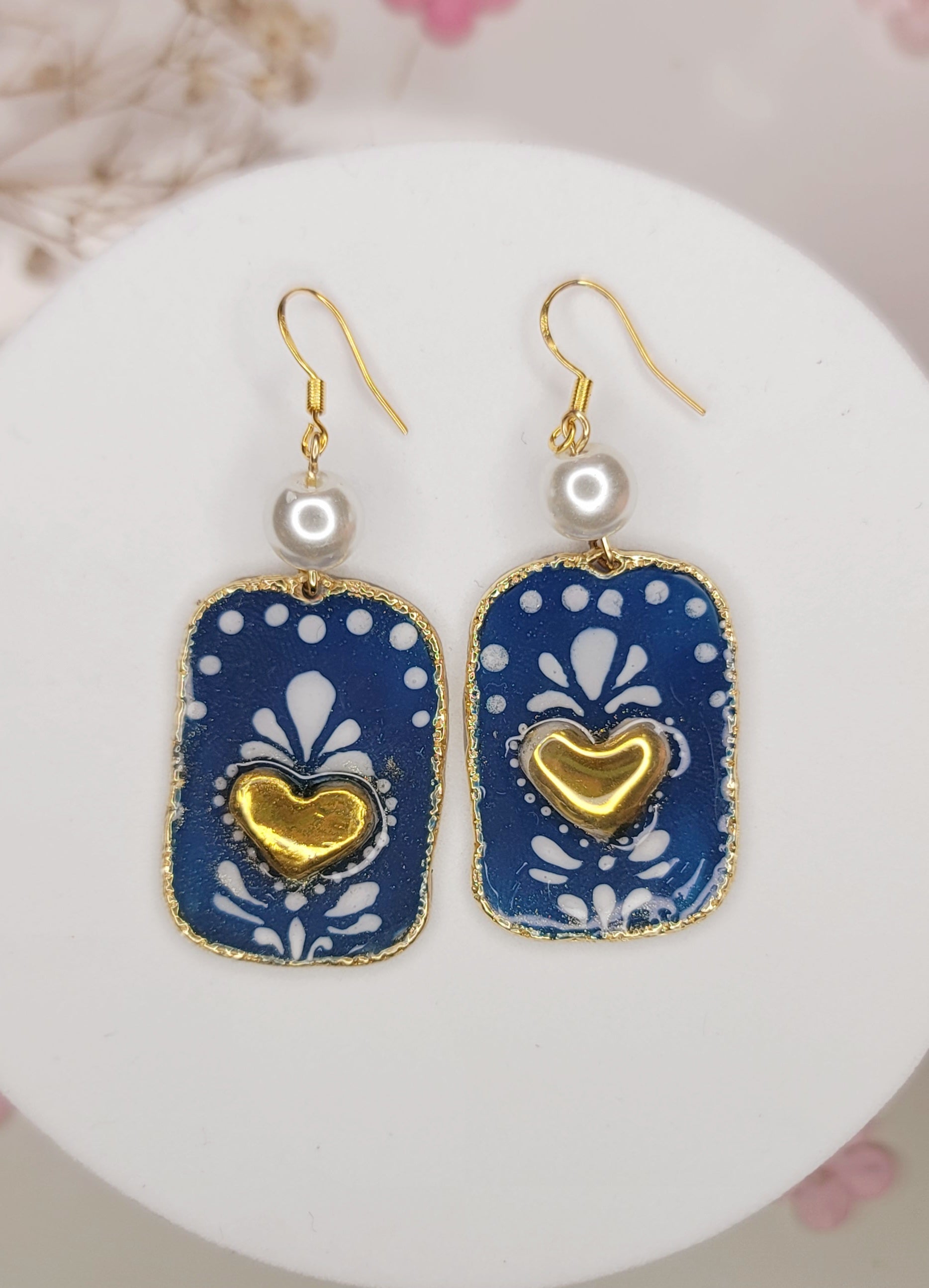 Inspired by traditional Talavera patterns, these deep blue tiles feature golden hearts and pearl accents for a bold artisan feel.