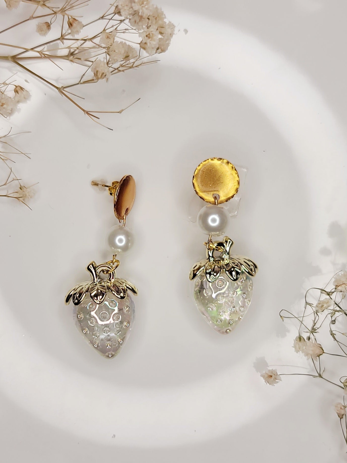Icy-clear strawberries with gold leaves and a delicate pearl stud. Sweet, playful, and sparkling with every move.