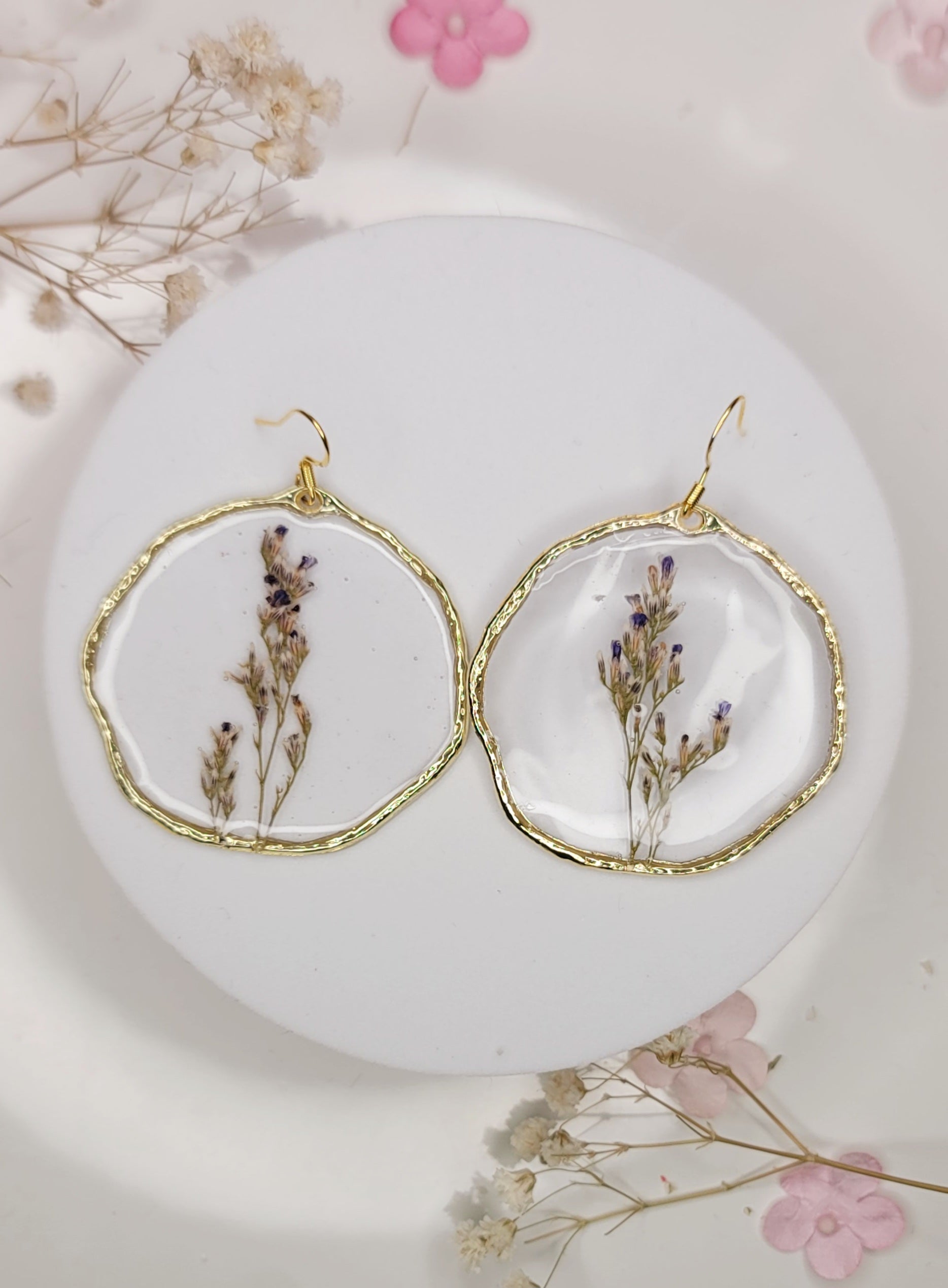Real pressed lavender stems floating inside a gold hammered hoop. Airy, botanical, and beautifully minimal.