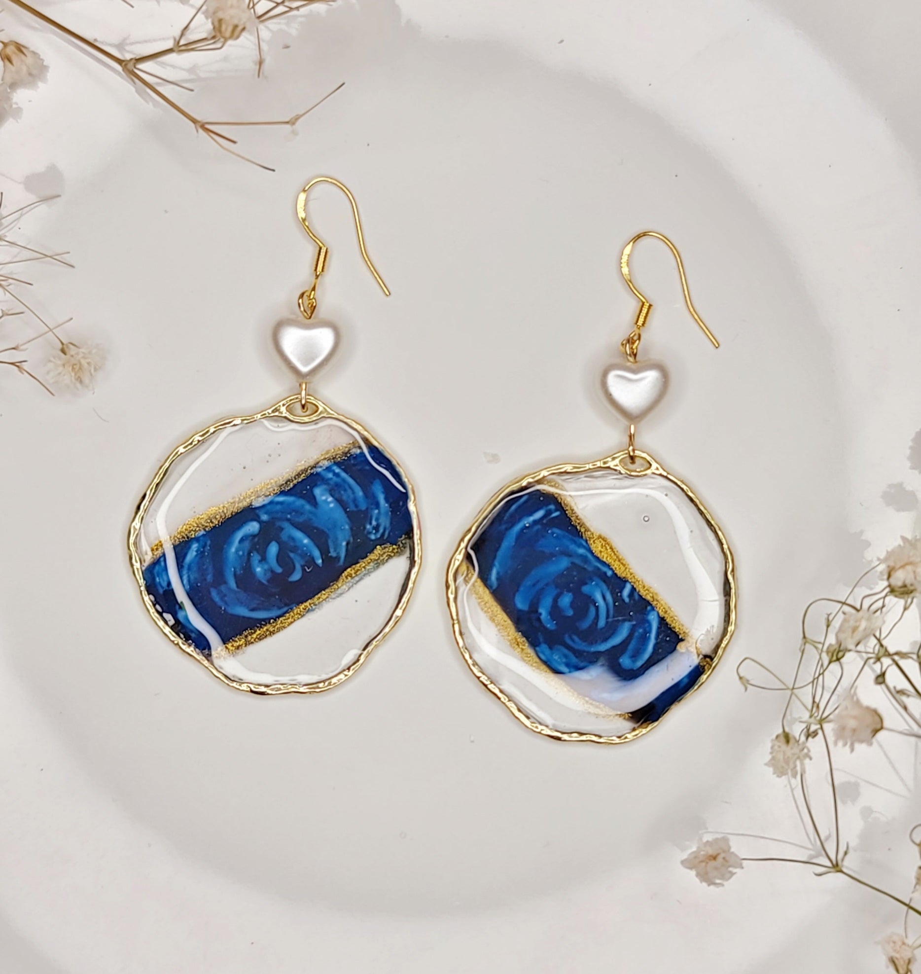 Hand-painted blue rose swirls framed in gold with a pearl heart accent. Lightweight, dreamy, and perfect for art-lovers.