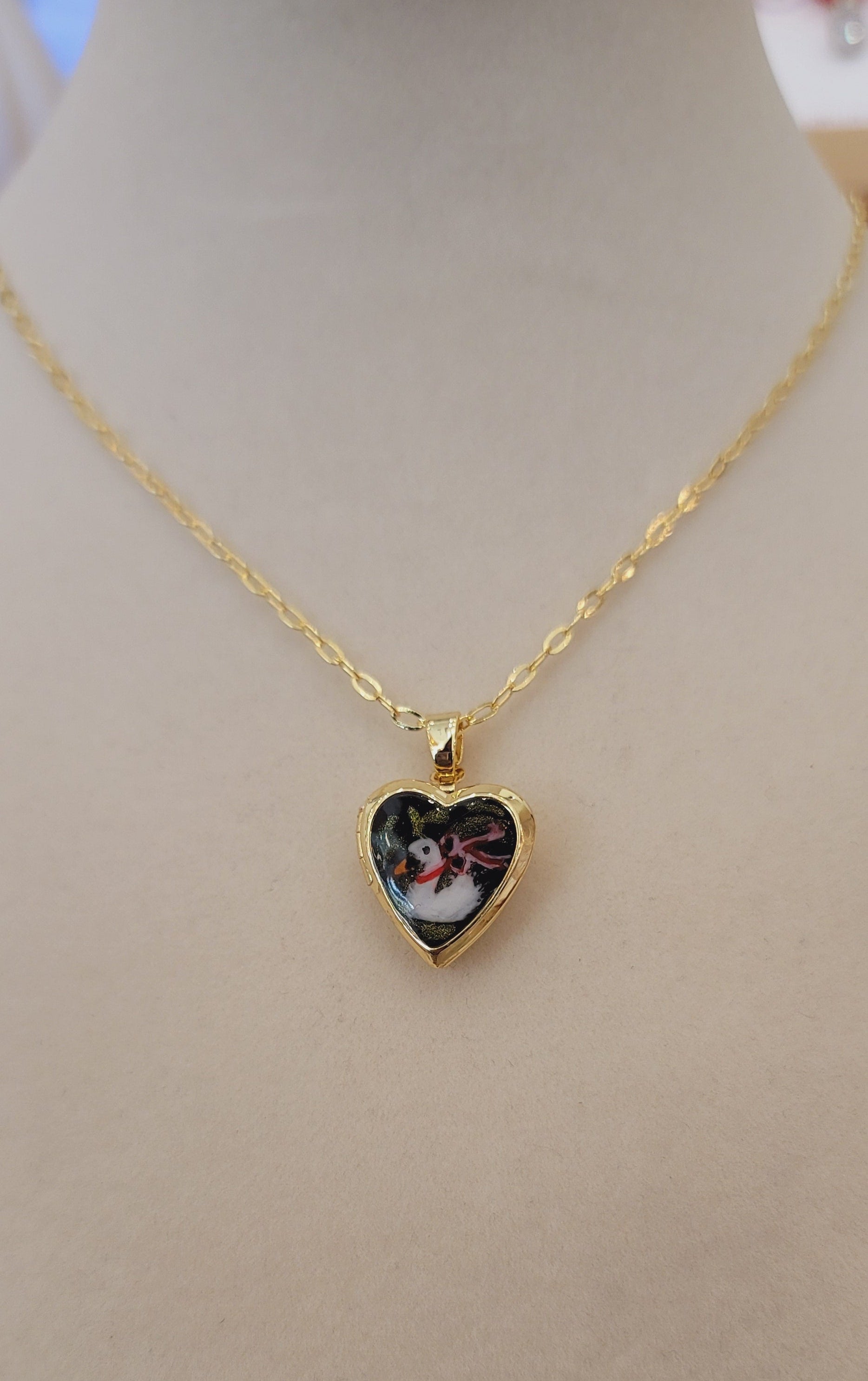 A delicate gold heart locket hand-painted with a graceful swan against a deep, night-inspired background. This piece symbolizes elegance, devotion, and quiet strength. Sealed for protection and finished on a gold-tone chain, each locket is one of a kind and painted with intention.