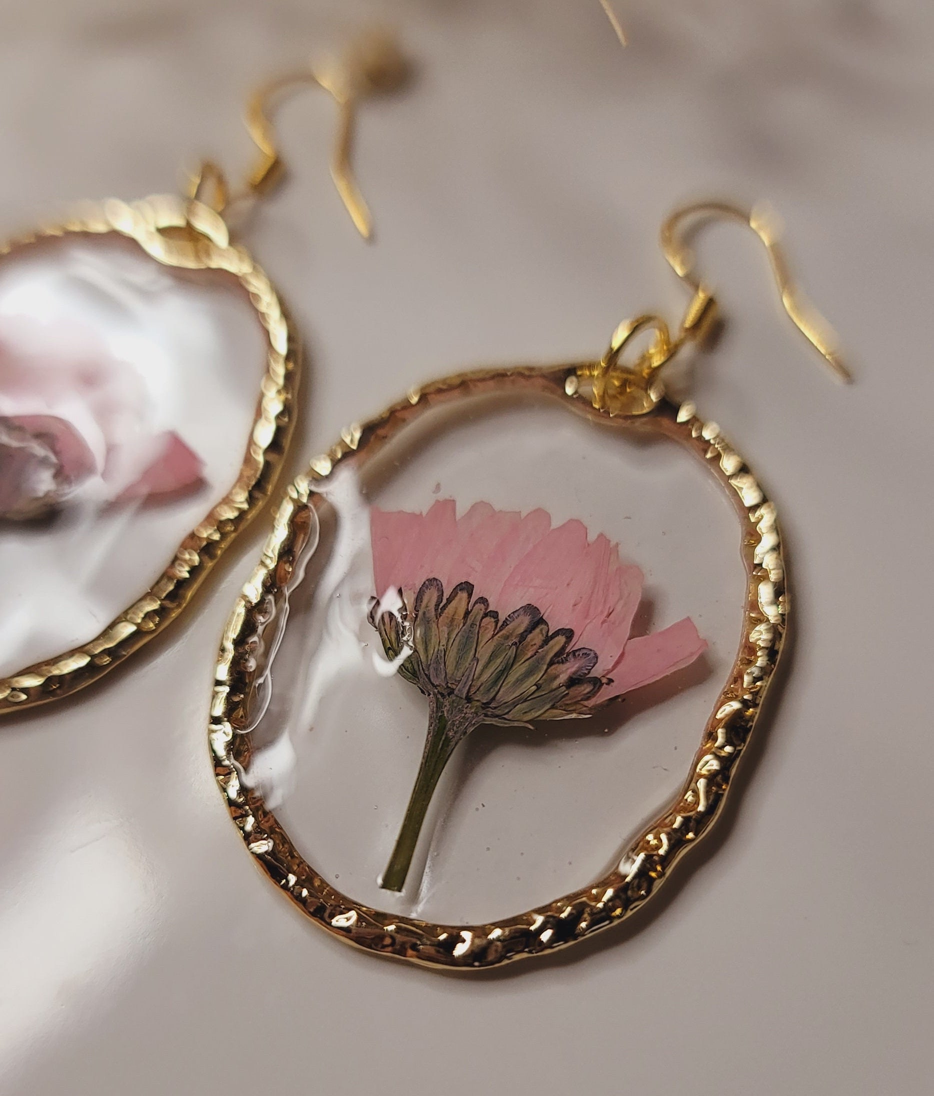 Soft pink pressed blossoms preserved in clear resin and surrounded by an organic gold bezel. Feminine, gentle, and timelessly beautiful.