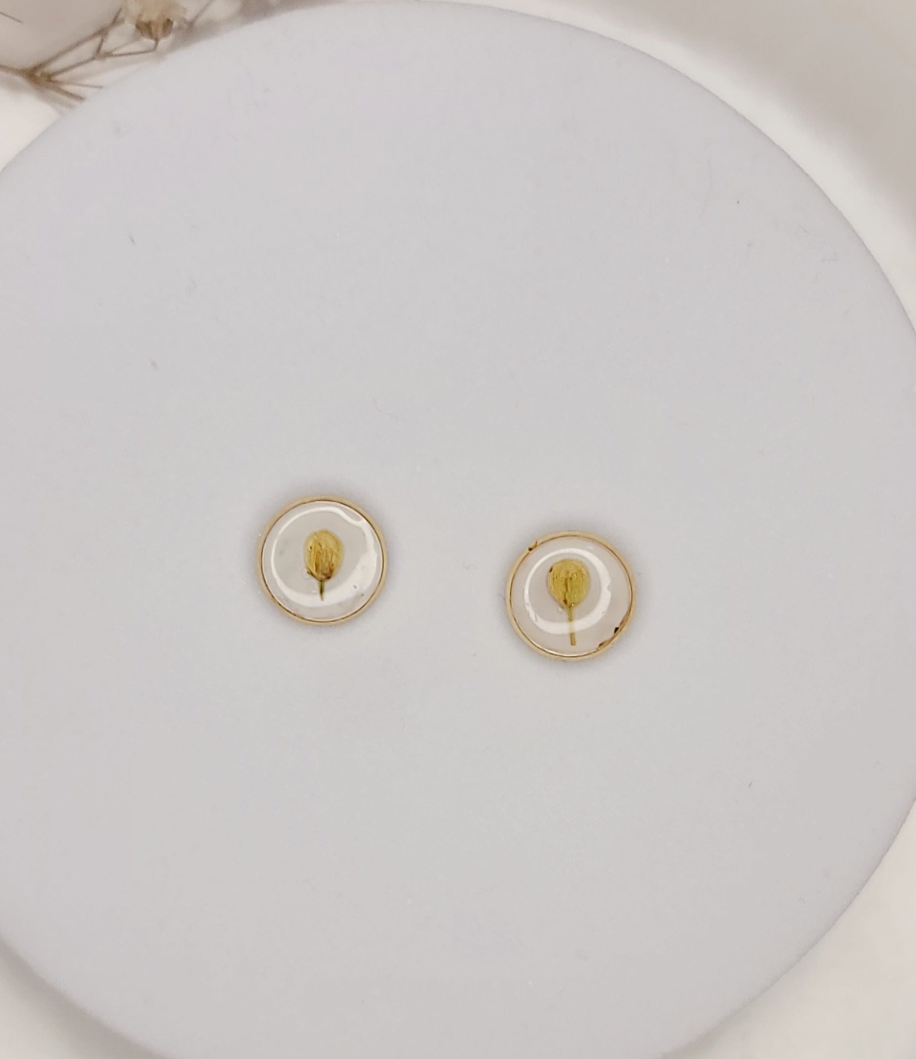 Mini dried florals encased in clear resin with a gold rim. Simple, dainty, and perfect for subtle nature lovers.
