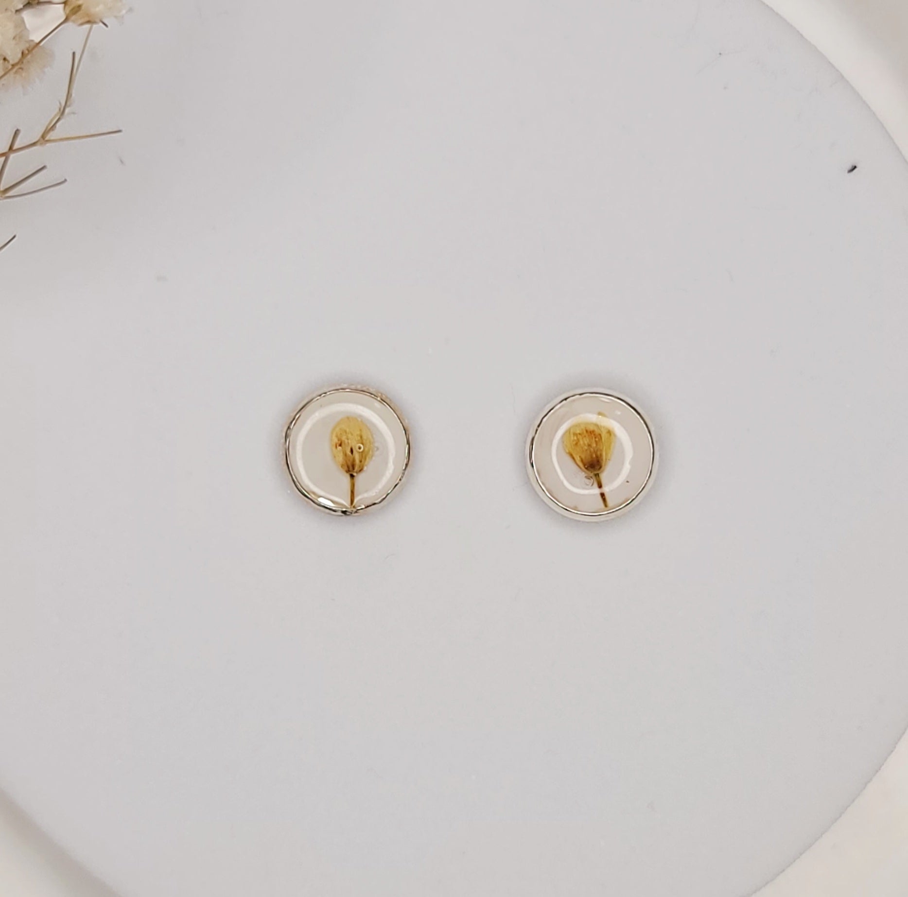 Minimal, dainty floral studs featuring real pressed botanicals for a subtle, earthy accent.